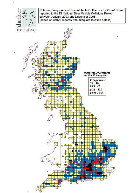 B) For a visual GB wide overview of relative rate of reported deer road casualties or related deer-vehicle collsions per unit AREA in differing Local authorities click images below, based on data for: